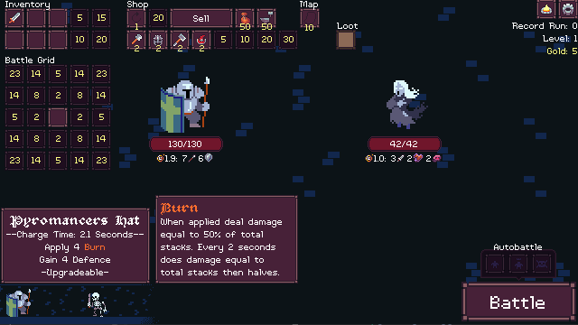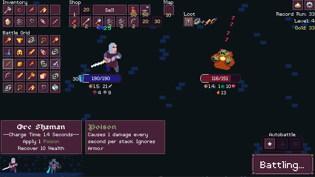 A Game about a Dungeon is a autobattler inspired by Backpack Hero, Hearthstone Battlegrounds, and various idle games. This is still a very early version of the game, that unfortunately lacks music or sound effects.